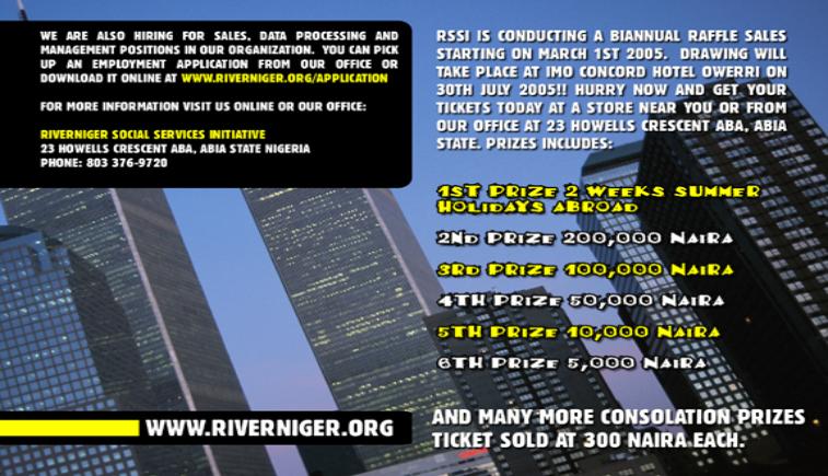 RSSI Fund Drive Mission statement: "To improve the social, economic condition of our youths including expanding their knowledge in the areas of Information technology. RSSI is a locally owned and operated organization with roots in Aba and Owerri. Main part of our mission will focus in serving our communities. We recognized our IT program as means to provide service to our community, and in addition to serving our community, RSSI will create awareness on the advantages self reliance in the society.
